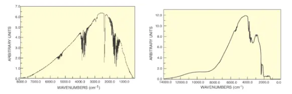FT-NIR instruments utilize the same method as FTIR with the difference that their source is more suitable for near infrared measurements. FTIR typically uses a Silicon Carbide source which peaks at nearly 5 m as compared to FT-NIR which uses QTH lamps which peak at nearly 2 m. Figures 6 a and b show the source spectra.