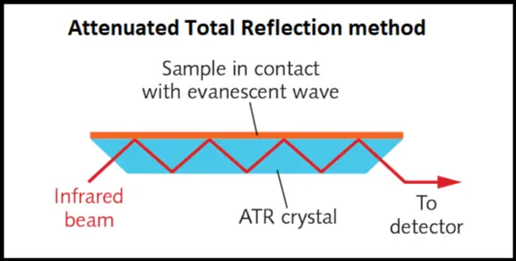 In this method a crystal of high refractive index is in contact with the sample surface. An infrared beam undergoes total internal reflection and generates an evanescent wave which penetrates into the material through depth of few microns. Each bounce produces some absorption of the beam and after several bounces, the IR beam reaches a detector. Since the absorption is strong, this technique has the advantage of probing several locations of the sample surface. One can see that this method is effective to probe only a thin layer on the surface of a material and if the bulk of the material needs to be probed, this method will fail.