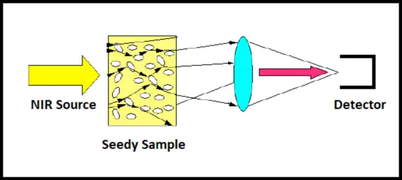 • For heterogeneous samples which are mostly found in food industry a different approach has to be taken. NIR is the choice for this seedy, watery material because the nir beam can penetrate through the material and bounce several times before reaching the detector. The technique of trans-reflectance is shown in Figure 4.