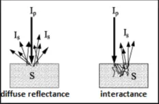 After undergoing multiple reflection through the volume of the sample, the beam finally finds it way to the detector and hence absorption spectra represent the bulk of the sample rather than just the touch of the surface as was done with ATR sampling technique used for FTIR. The trans-reflectance method has the disadvantage that the source should be separate from the detector and can not be embedded within the spectrometer. Another method, called interactome is shown in figure 5 and is compared with diffused reflectance.