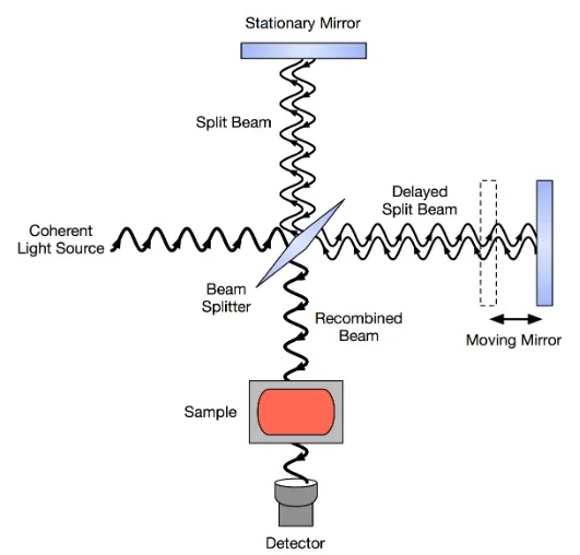 In principle, there are two ways in which spectroscopic methods use to probe a material. In one method, called the dispersive method, individual wavelengths which are produced by shining a broadband source on a diffraction grating or a prism are impingent on a material and absorption at each wavelength is measured. Near Infra-red diffuse reflectance method utilizes this technique. In the second method, the full beam of the broad-band source shines on the input of an interferometer where the sample whose absorption is to be measured is placed in one arm. The interferometer consists of a stationary mirror and a moving mirror and the scanning is done through the movement of the moving mirror. An interference pattern is hence recorded whose Fourier transform regenerates the spectral signal. The same measurement is done without the presence of the absorption material in one arm and by dividing the former by the latter, an absorption spectrum for the material is generated. Both FT-IR and FT-NIR utilize this method. Figure 2 shows the interferometer for a FT-IR method: