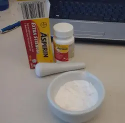 Figure 4a -Aspirin in a mortar. Figure 4b Ground Aspirin ready for measurement.