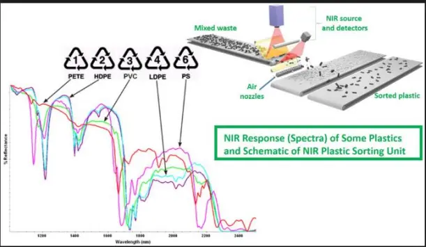 Since each type of polymer has its own NIR spectral signature, the process of separation can be made much faster by identifying different types of plastic based on their spectral signature. Figure 6 below shows the concept where a NIR source and detector are used to collect the spectra of a mixed bunch of plastic. The detector also uses an imaging system to identify the position of different types of plastic based on their spectra on the moving belt. When the collection point arrives, programmed air nozzles puff air with different amounts of pushing force on different types of plastic which fall on different bins and get separated.