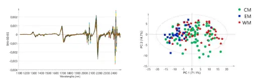 As an example of using NIR spectroscopy to find the geographical origin, one can refer to a study in which Chinese Tilapia fillet from 3 different provinces of china (Guangdong, Hainan and Fujian) were studied using NIR spectroscopy (Reference 7). In the study, near-IR spectra of the fish was collected in the range 1000-2500 nm and a chemometric method called SIMCA was used with 80% success rate in distinguishing the different geographical origins. As an another example, European seabass from the western, central and eastern Mediterranean sea provenances were studied using NEAR-IR spectroscopy and a PLS-DA chemometric method managed to classify 100% eastern, 88% central and 85% western provenances correctly (Reference 8). Figure 4 shows a typical pre-processed spectra from sea bass samples and grouping based on a score plot after doing a PCA analysis where CM, EM and WM refer to Central, Eastern and Western Mediterranean.